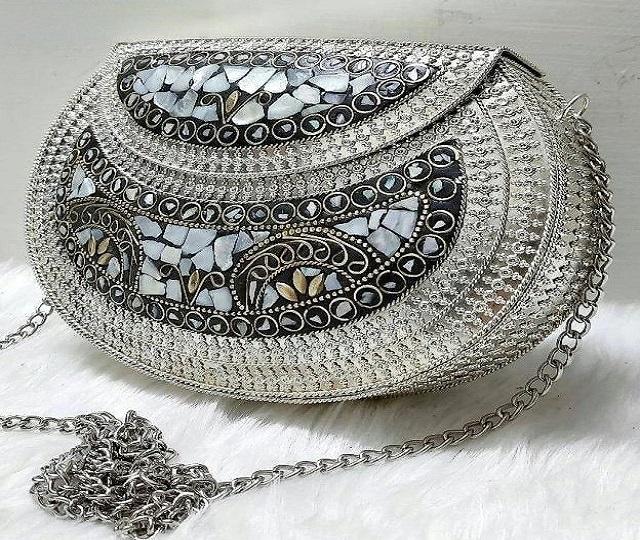 Bolso de Mano de Diseño de Lujo con Pedrería, Bolsos Hechos a Mano Plateados para Eventos Nocturnos, Diseñador, Listo para Enviar, Resina, Latón, Mosaico con Metal