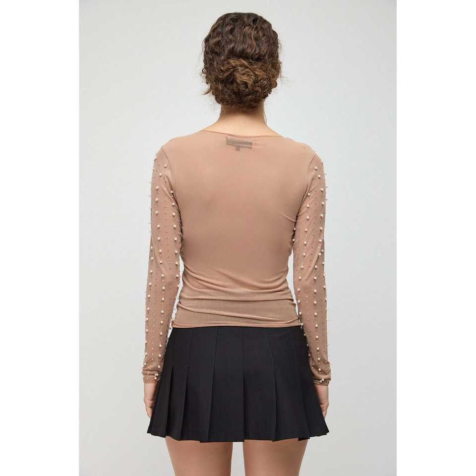 Blusa de Tela Transparente con Cuello Redondo y Manga Corta, Adornada con Logotipo Frontal con Pedrería, 100% Poliéster