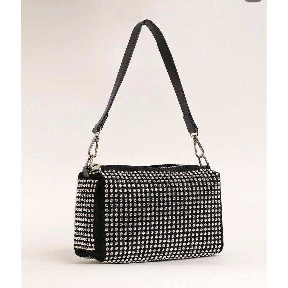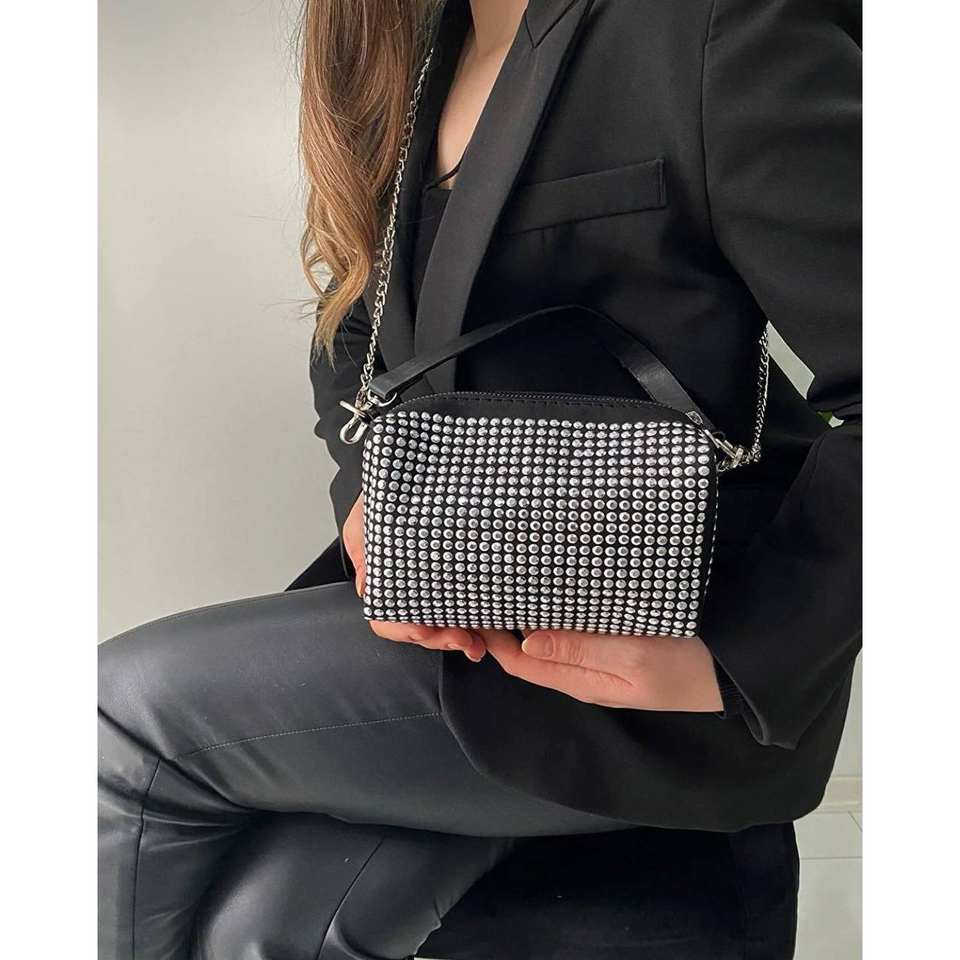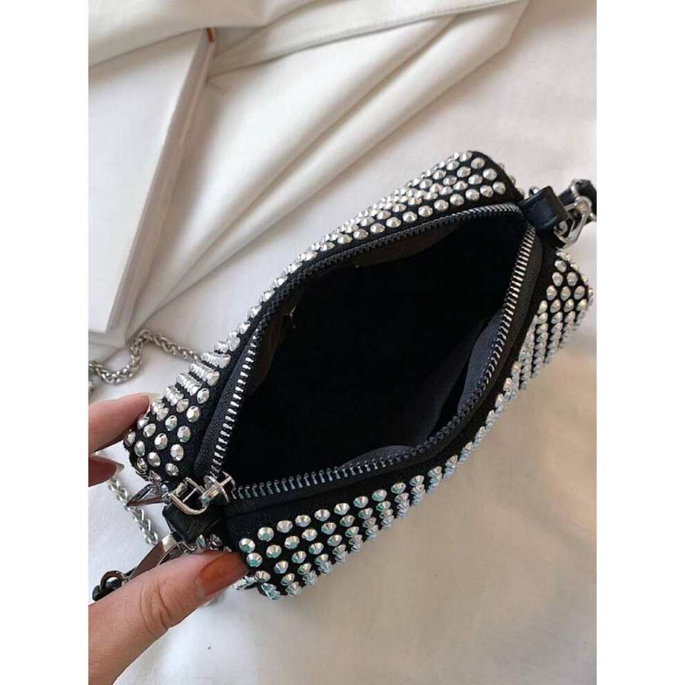 Bolso de Noche Rectangular con Adornos de Piedras, Correa de Cadena y Acabado Metálico Brillante