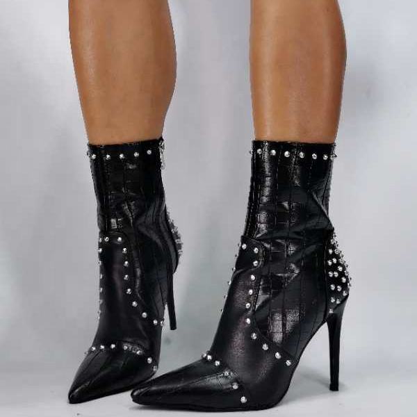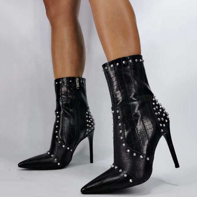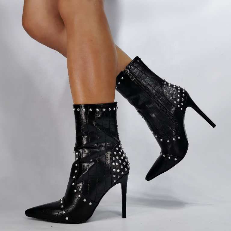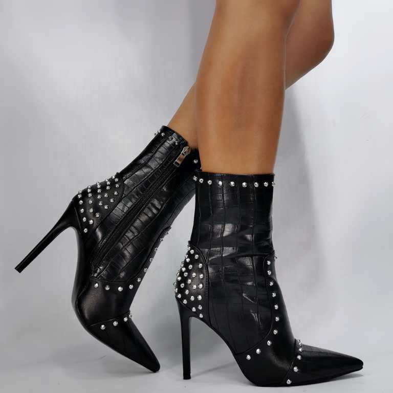 Botines de mujer con estampado de piedra y remaches, talla grande 43, con cremallera lateral decorativa, tacón alto delgado, punta fina, botines cortos para mujer