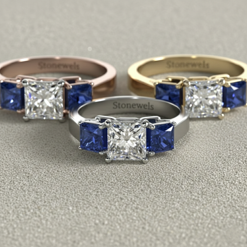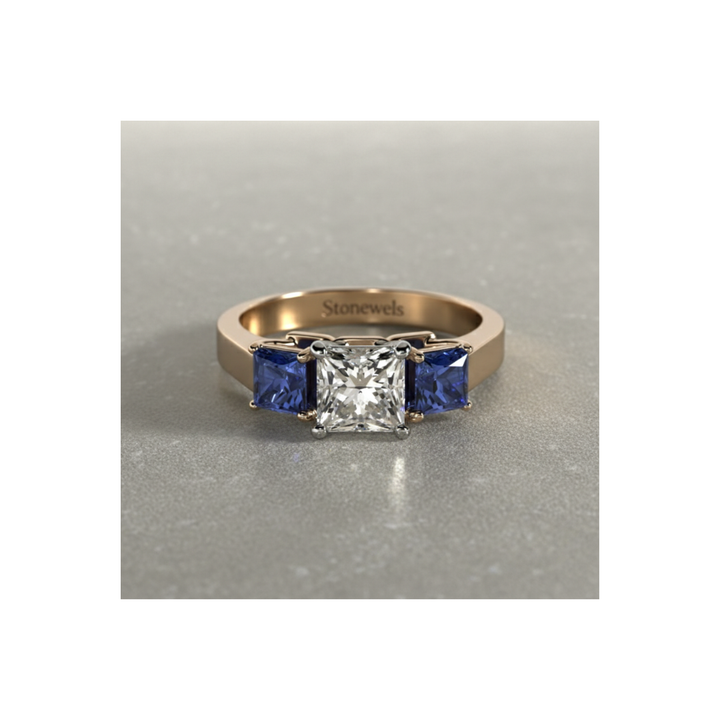 Princess Cut Blue Sapphire Three Stone Ring