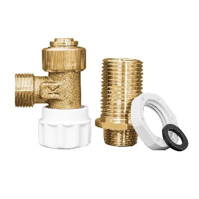 Válvula de cierre para cisternas empotradas de latón con conector de plástico blanco y junta tórica