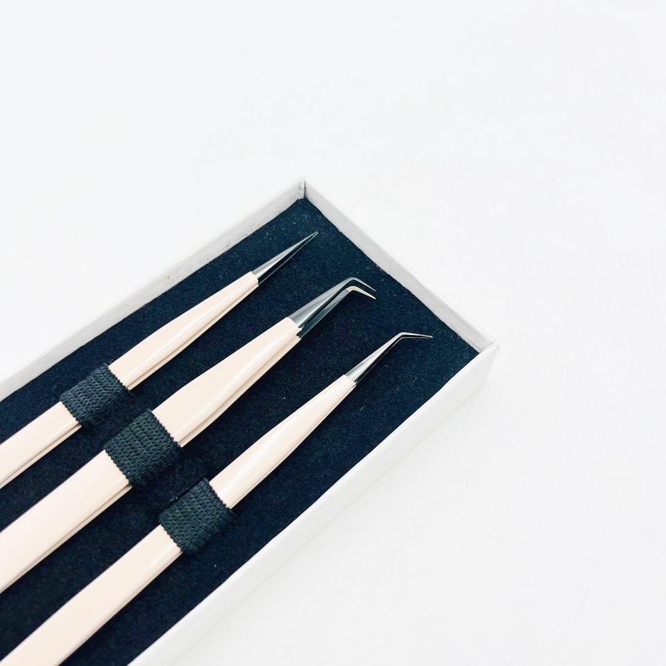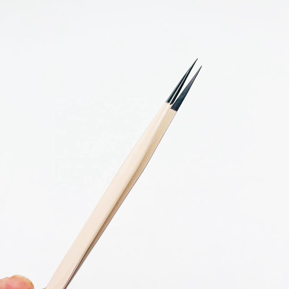 Pinzas de pestañas rectas puntiagudas en polvo de melocotón recubierto con pinzas de pestañas de sujeción fuerte de punto negro de plasma a precios bajos
