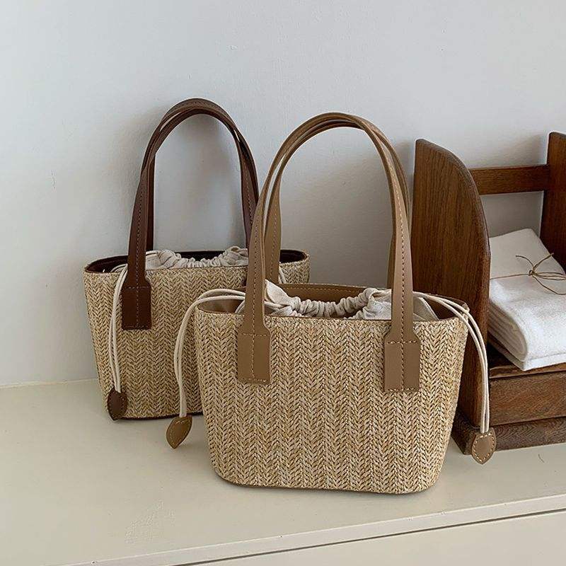 Bolso Tote Mini de Paja Tejida con Cierre de Cordón, Tejido Suave, Bolso de Mano para Mujer, Uso Diario Informal, Color Albaricoque, Marrón, Negro