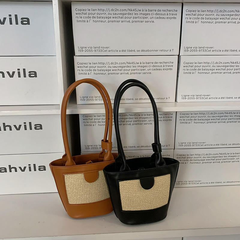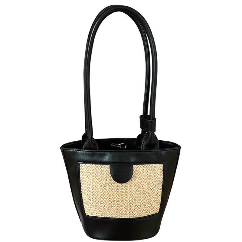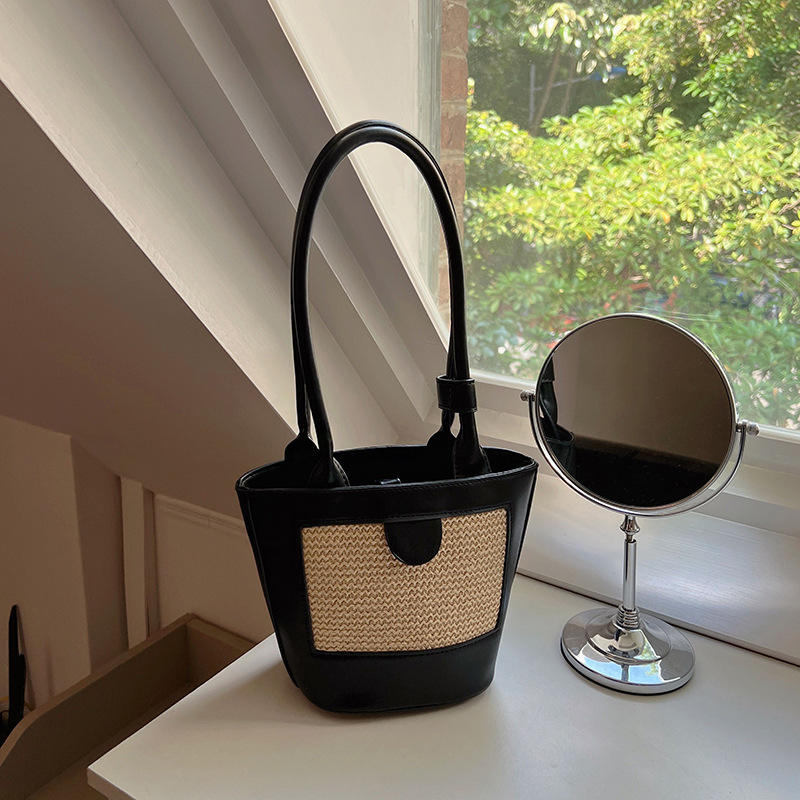 Bolso tote de color liso tejido en paja, estilo cubo negro con bolsillo con cremallera, diseño de empalmes, verano 2022, bolso de mano para mujer