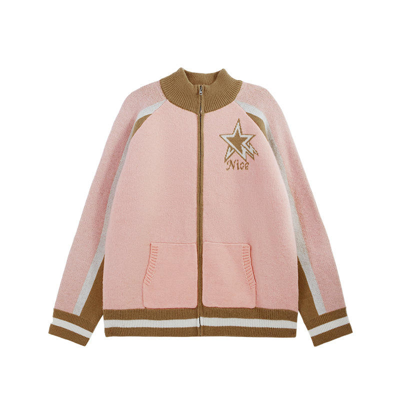 Street Style Color-Block Mock Neck Zip-up Cardigan Sweater Otoño Invierno Custom Patchwork Knit Top