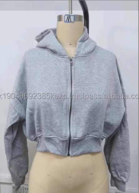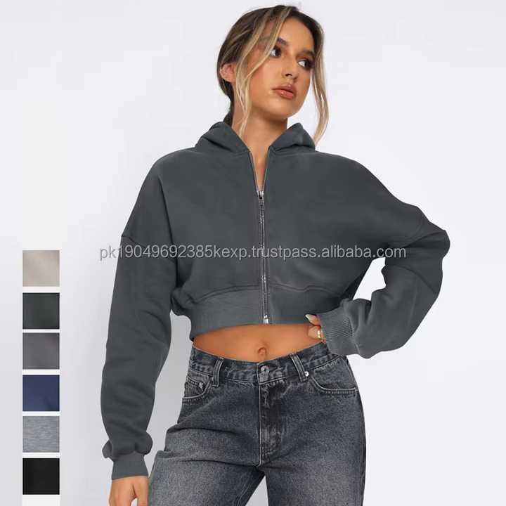 Street Wear Drop Shoulder Hoodie Dark Grey Fleece Manga larga Chaquetas recortadas Suéter Crop Top Cremallera Sudadera con capucha para mujer