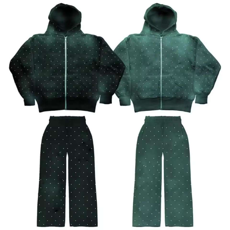 Conjunto Deportivo para Hombre, Sudadera con Capucha y Cremallera, Estilo Vintage, Lavado Ácido, con Pedrería, y Pantalones Deportivos Acampanados