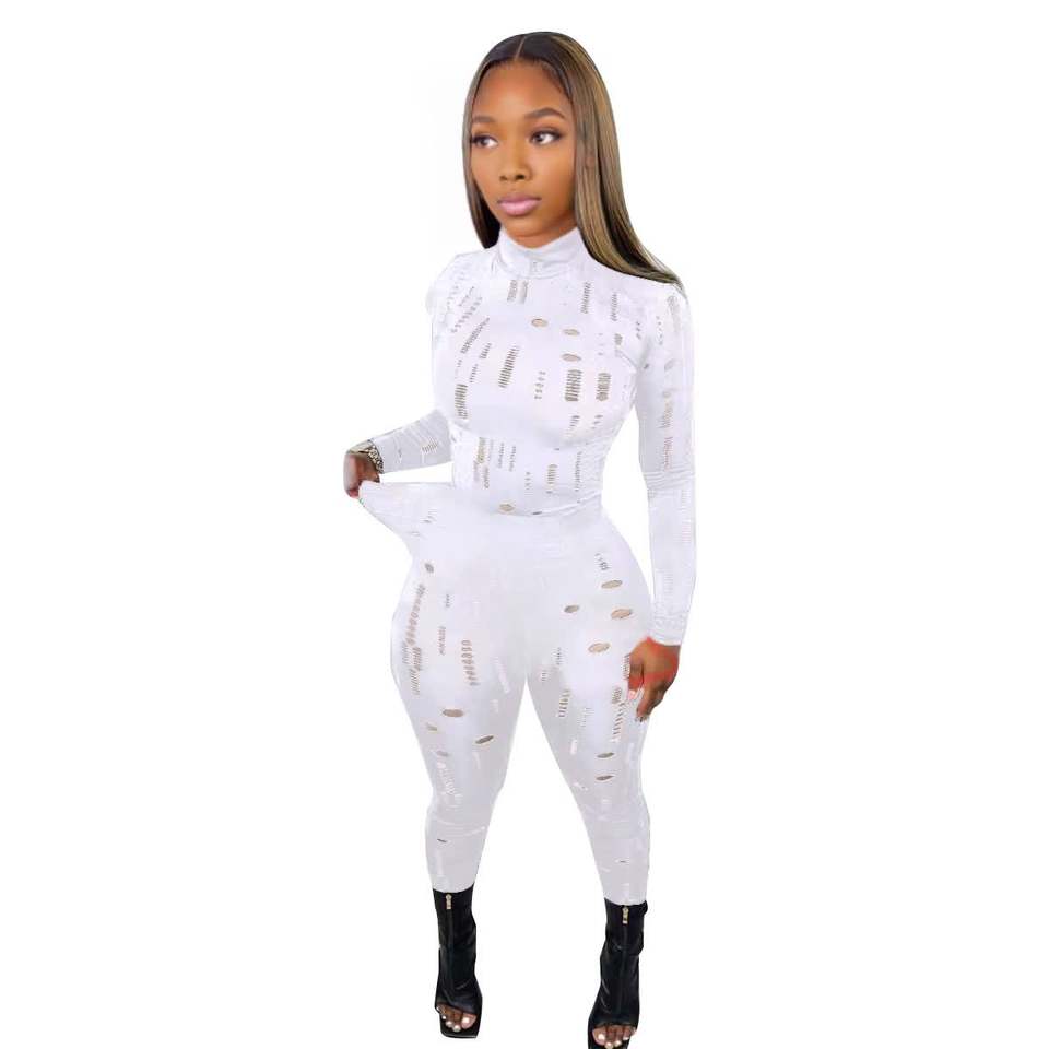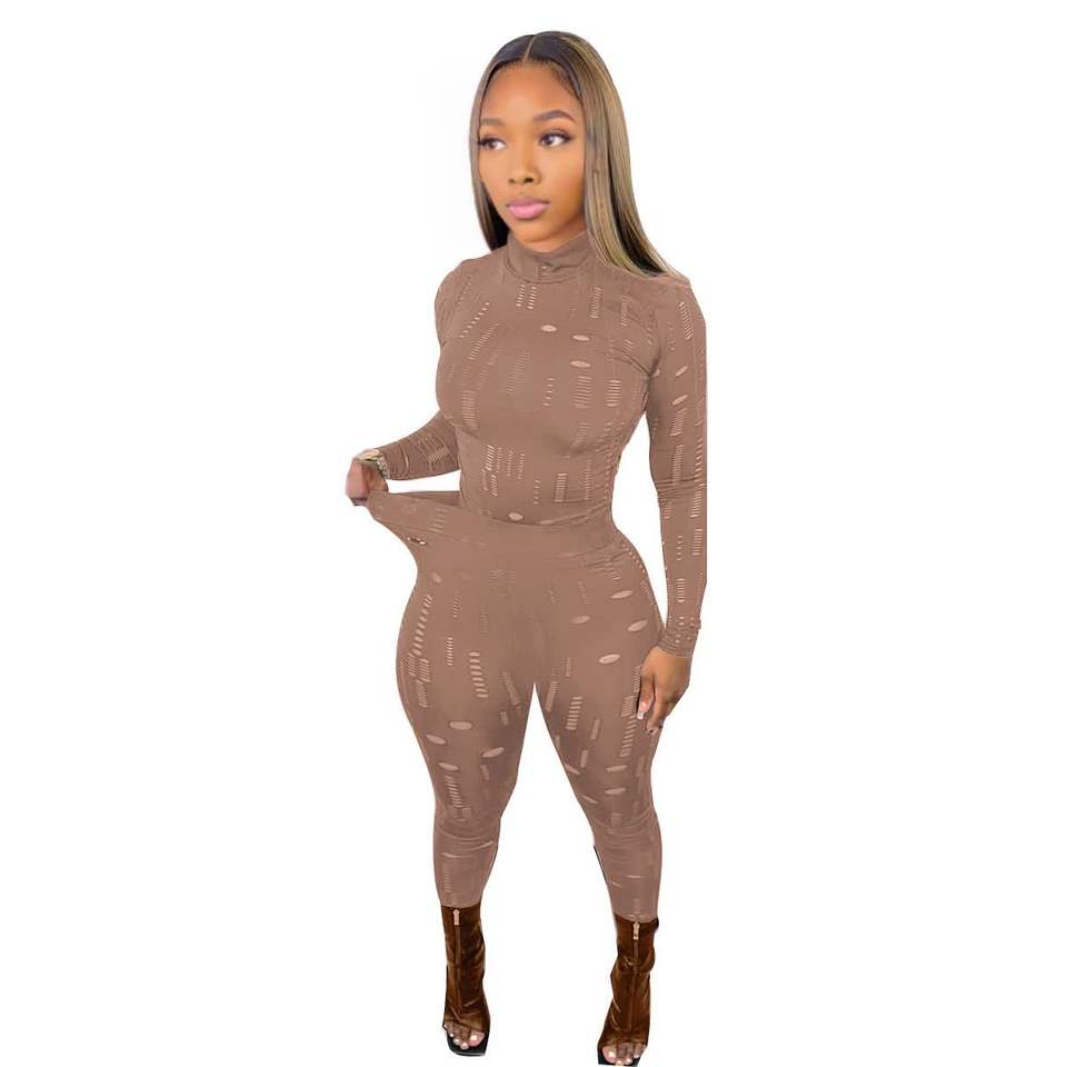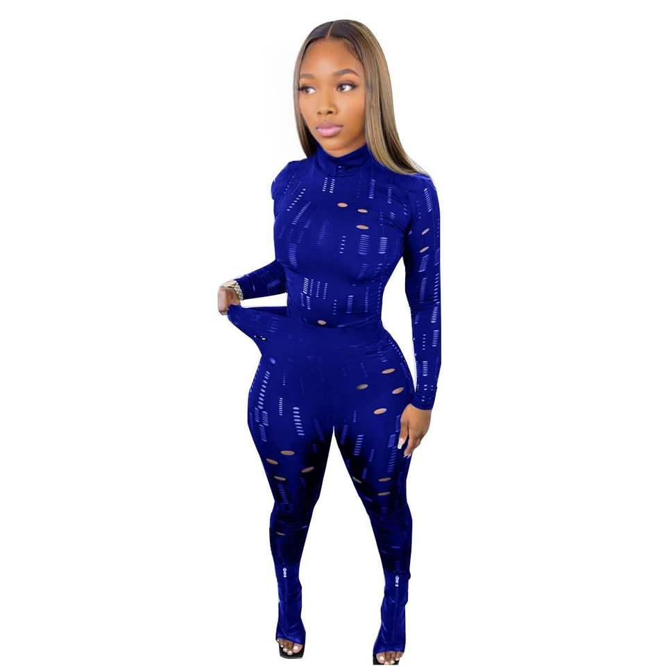 Conjunto de 2 Piezas para Mujer, Top Elástico de Cuello Alto y Manga Larga con Rasgaduras y Pantalones Chambray, a la Moda