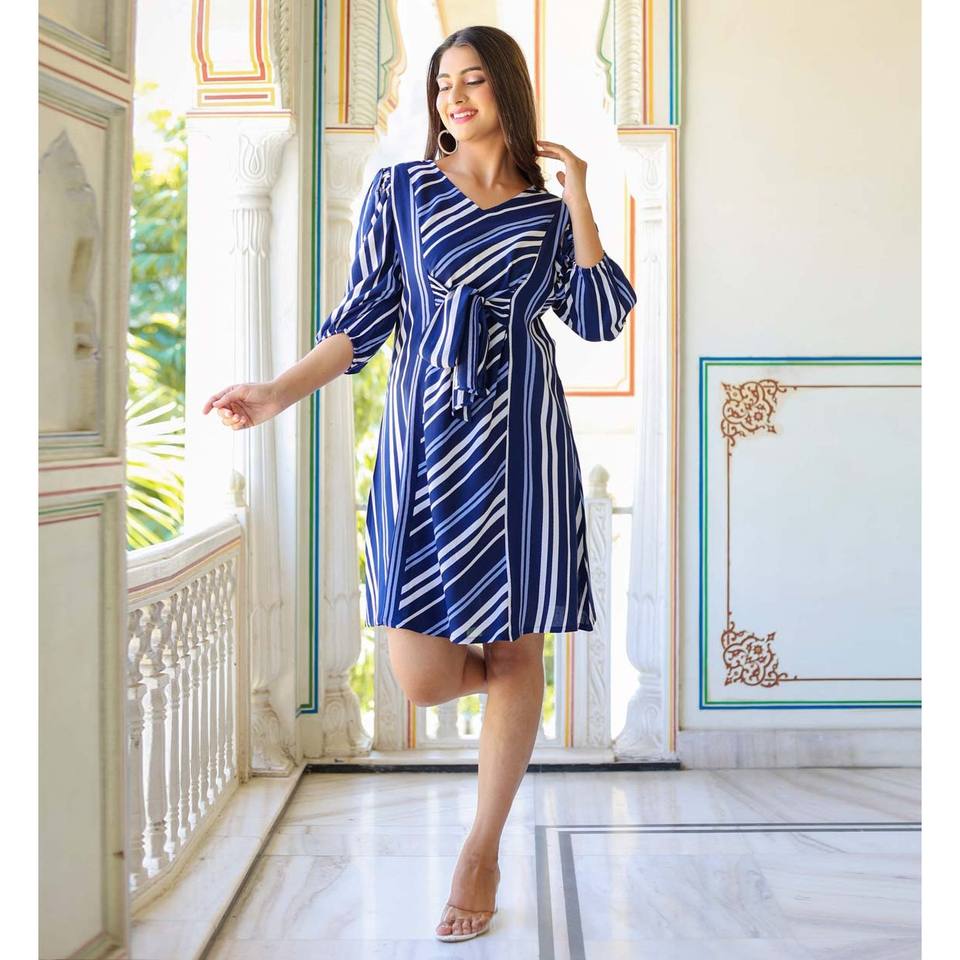 Vestido informal acampanado de rayón azul con estampado de rayas, modesto, a la moda, hasta el suelo, diseño personalizado, Club, día, ocasiones festivas, 2017