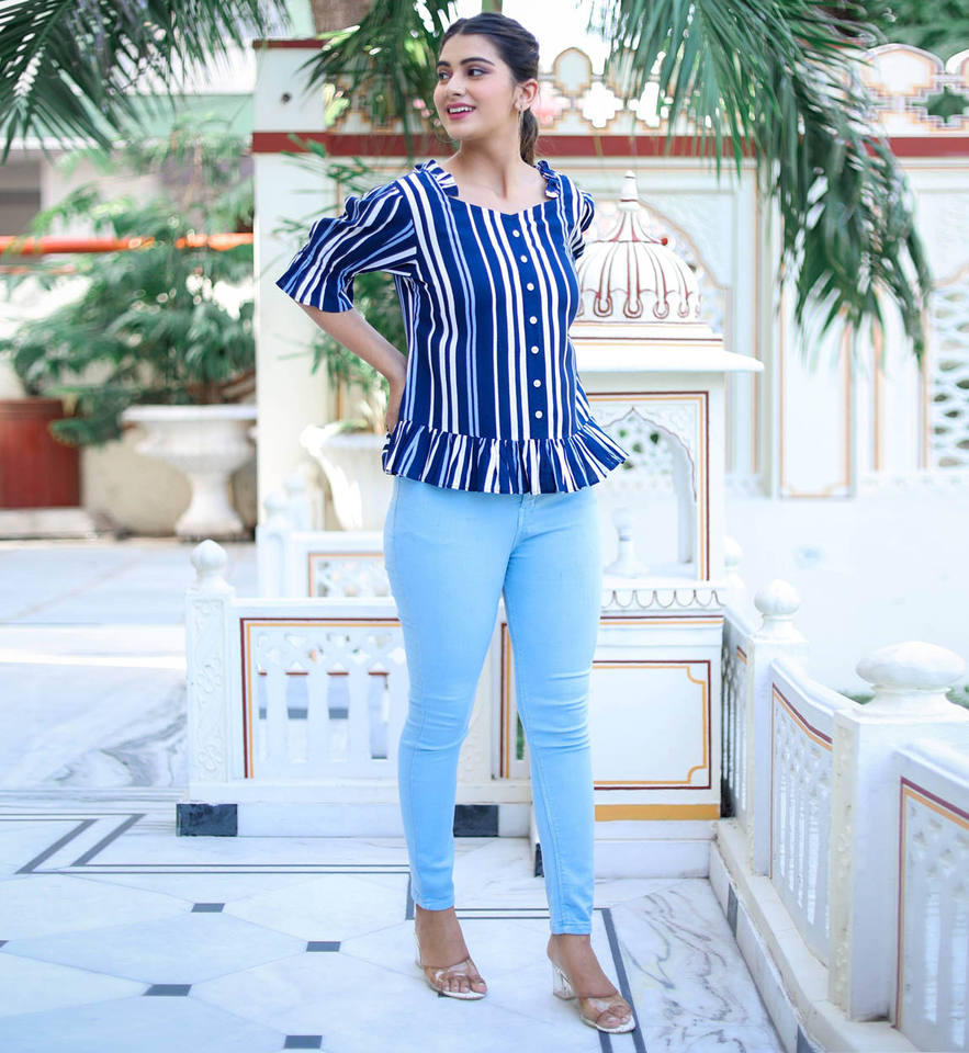 Blusa Formal para Mujer con Estampado de Rayas y Volantes, Color Azul, Elegante, Ligera, Cómoda, a la Moda, Femenina, Conjunto de Una Pieza