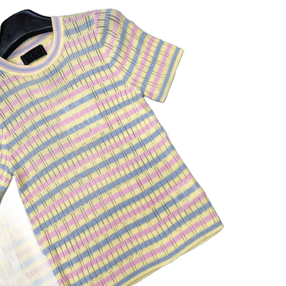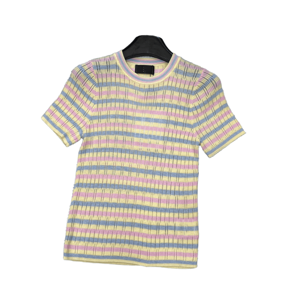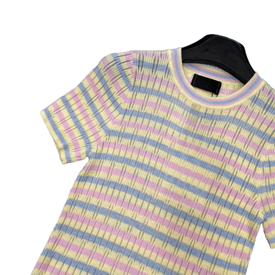 Camiseta de Manga Corta con Cuello Redondo y Tejido Acanalado a Rayas, Prenda de Punto Transpirable Informal para Uso Diario