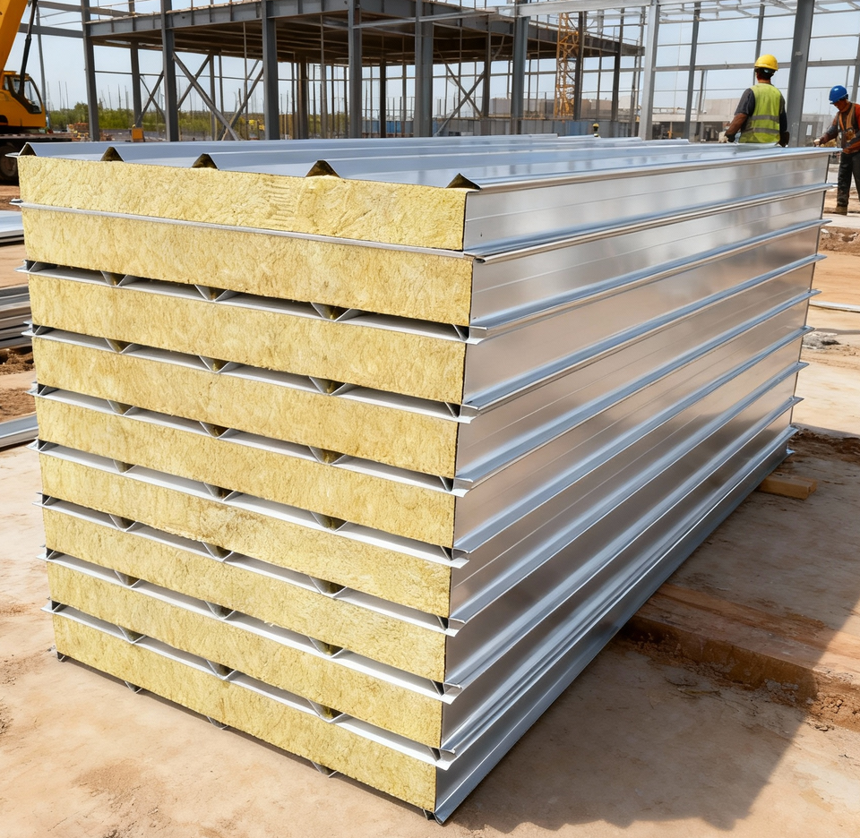 Panel sándwich de lana de roca resistente a la intemperie, resistente y aislante, perfecto para techos de almacén y fábrica