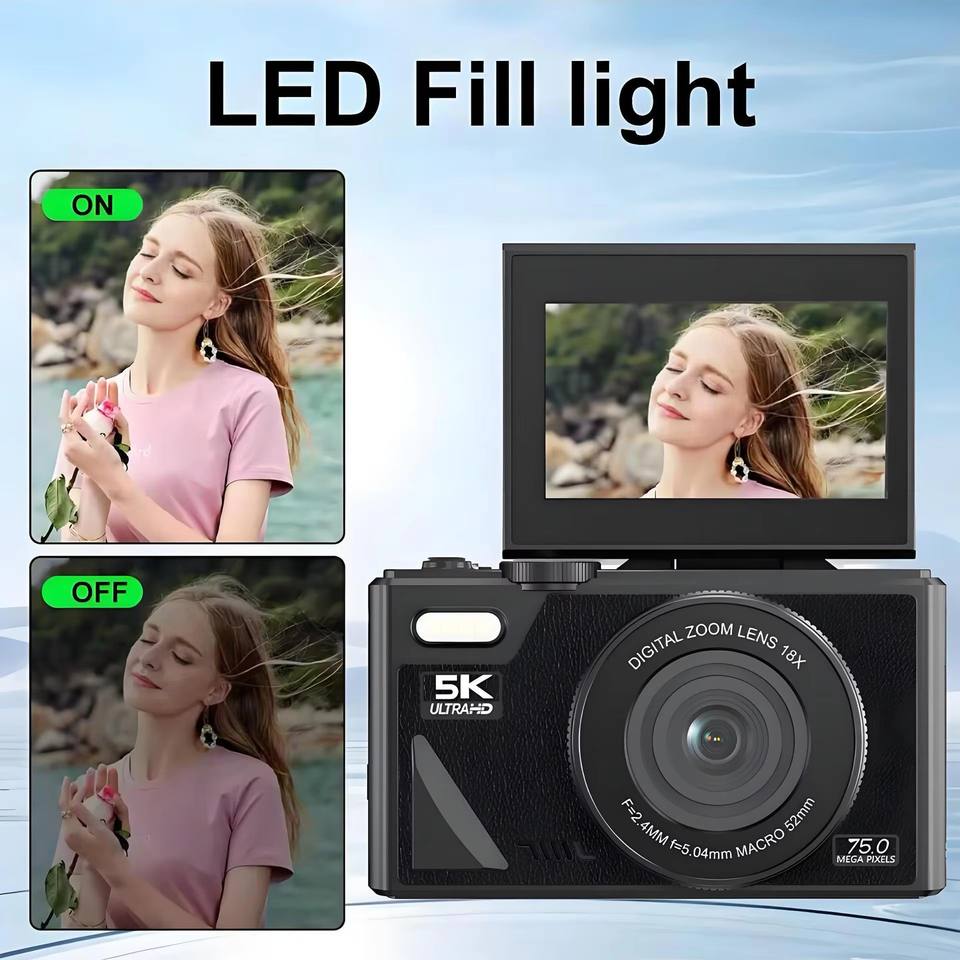 Cámara Digital para Estudiantes con Pantalla Abatible 5K, Zoom Digital 18X, Ultra HD de 75MP y Flash