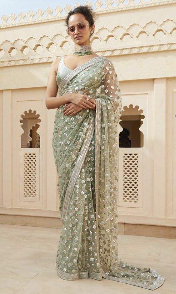 Impresionante Sari hermoso con trabajo manual de diseñador exclusivo que incluye cuentas de vidrio y piedra para funciones de boda y fiesta