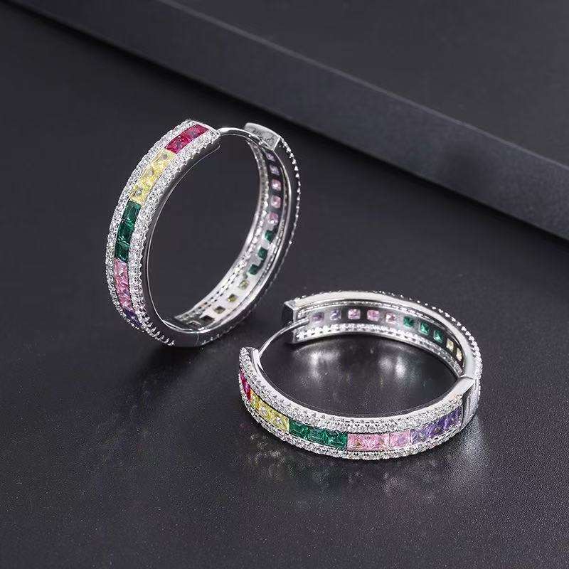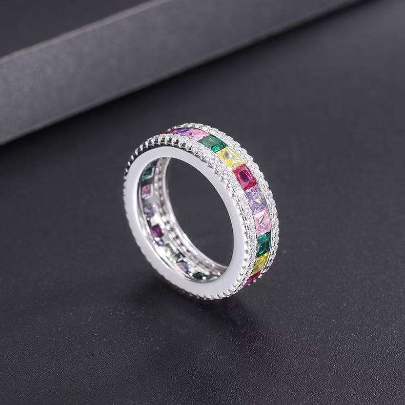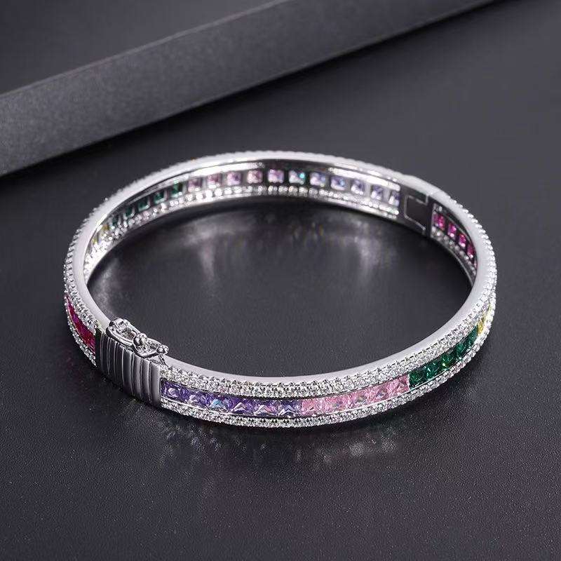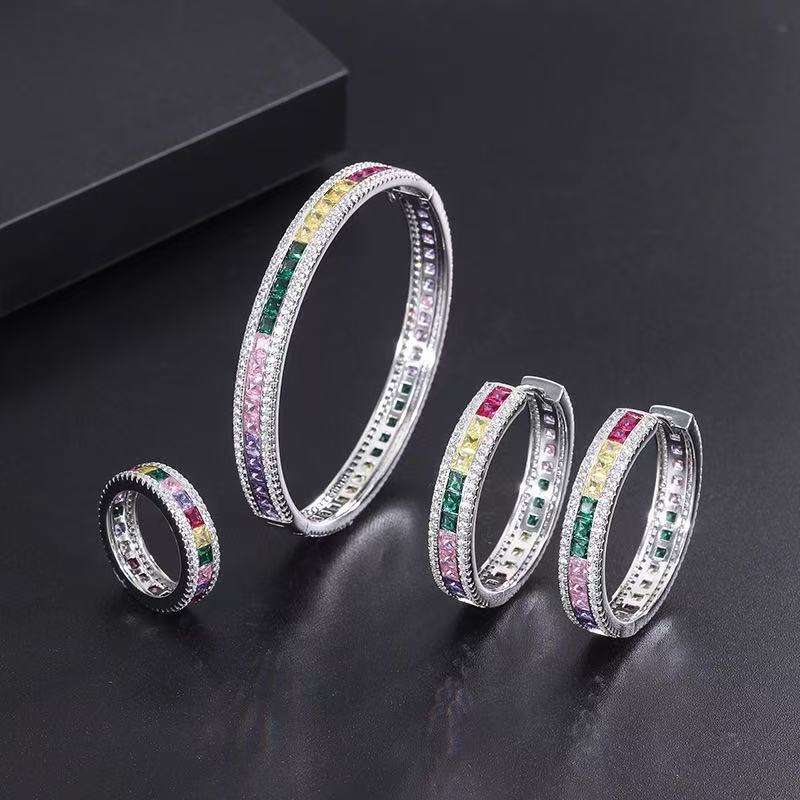 Impresionante Conjunto de Anillo y Brazalete con Circonitas Cúbicas Multicolor en Corte Cuadrado, Estilo Arcoíris, para Fiestas y Vacaciones de Lujo