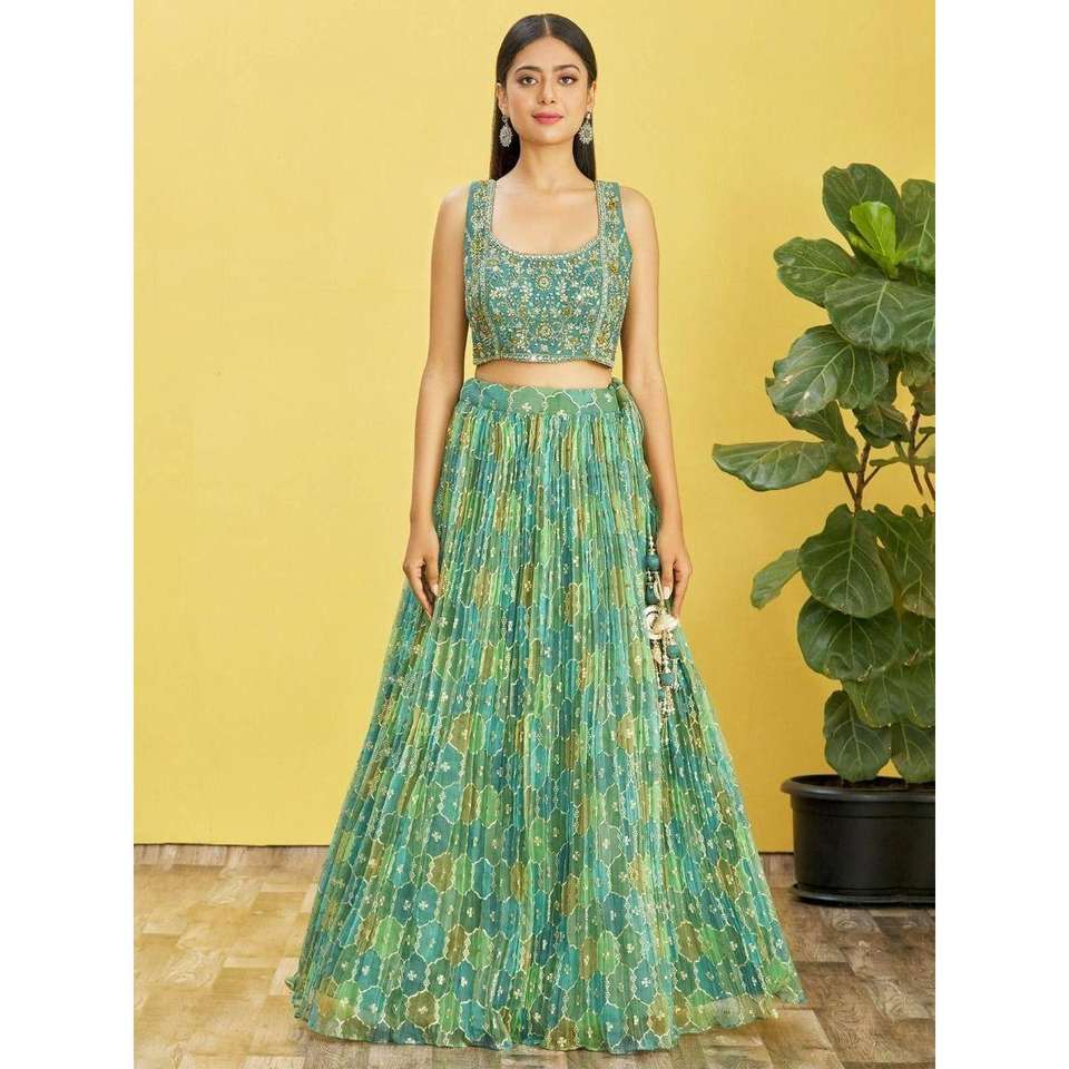 Impresionante mar verde espejo trabajo Organza boda Lehenga Choli