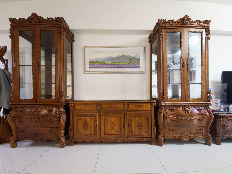 Impresionante y Hermoso Mueble de Almacenamiento de Madera de Teca Tallada a Mano de Estilo Europeo con 2 Puertas y 3 Cajones para Sala de Estar