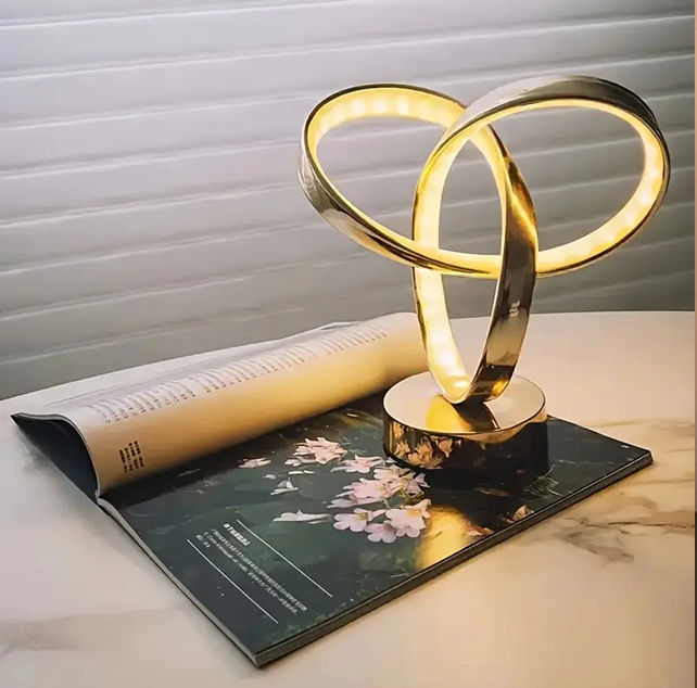 Impresionante Lámpara de Mesa LED Contemporánea con un Diseño de Doble Aro Entrelazado con un Acabado Dorado Metálico, a Precio de Mayoreo
