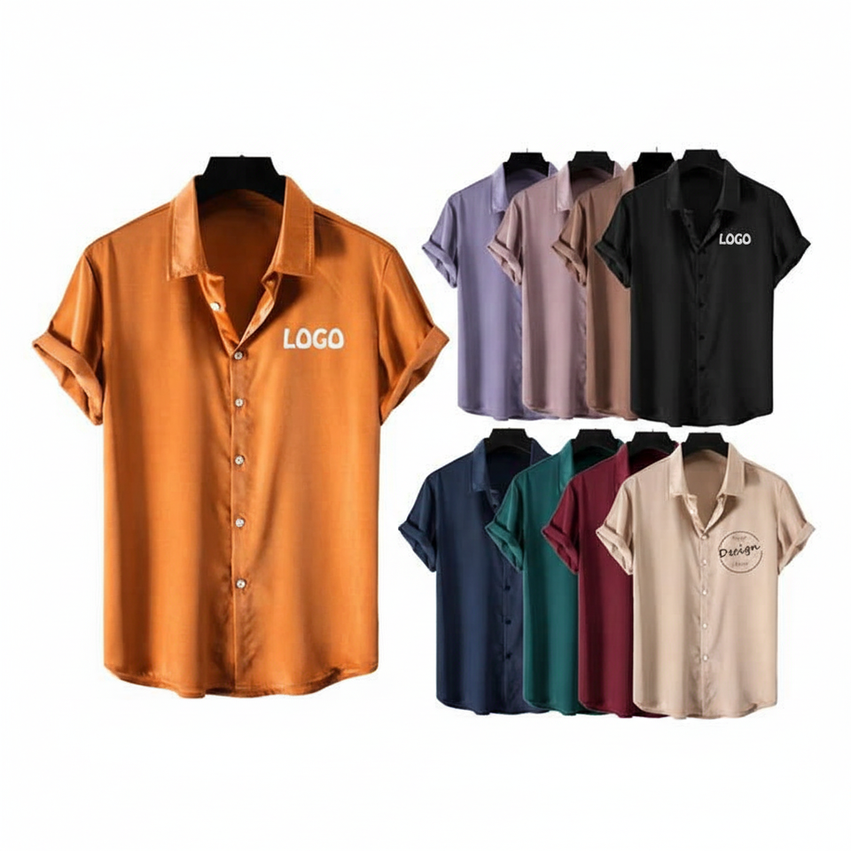 Camisas de satén de color sólido personalizadas con estilo, camisa transpirable de manga corta con botones para hombres y mujeres, precio al por mayor