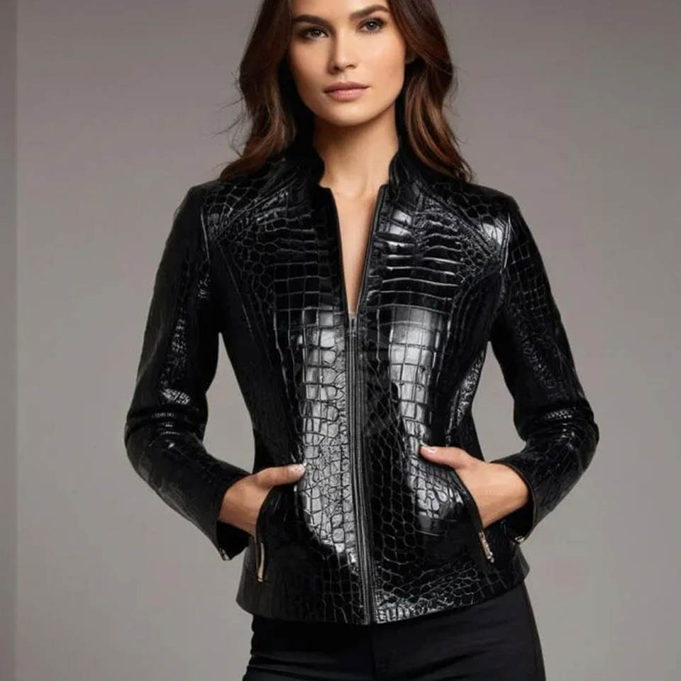Chaqueta de Cuero con Estampado Elegante y Textura Pulida, Tejida, Transpirable, Ligera y Ecológica, Diseño para Mujer