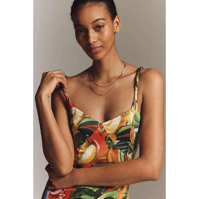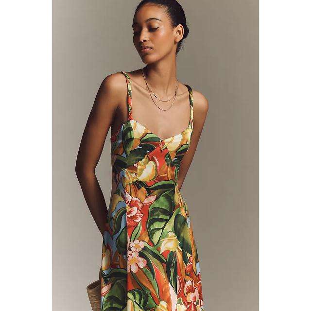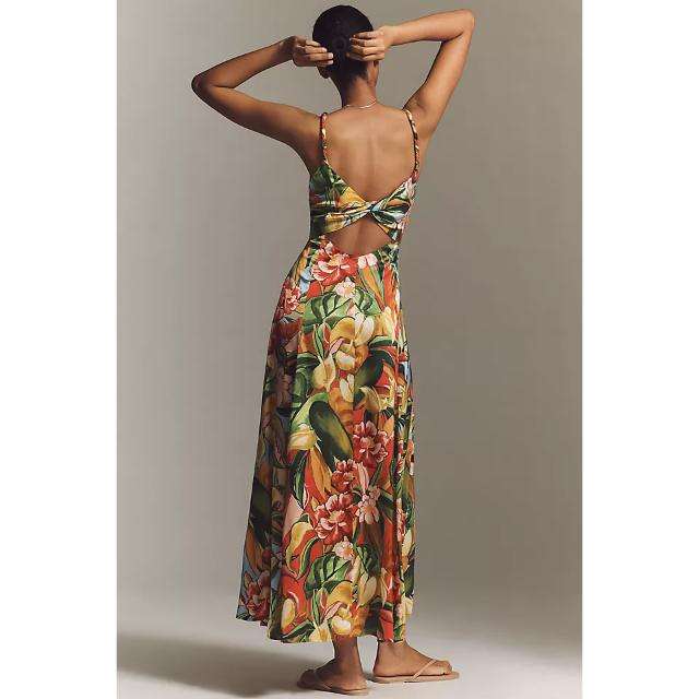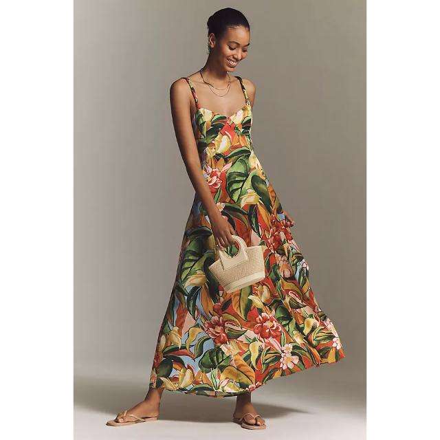 Elegante Vestido Maxi con Cuello en V de Farm Rio X Anthropologie, Estilo Moderno y Natural, Ideal para una Elegancia de Día y de Noche
