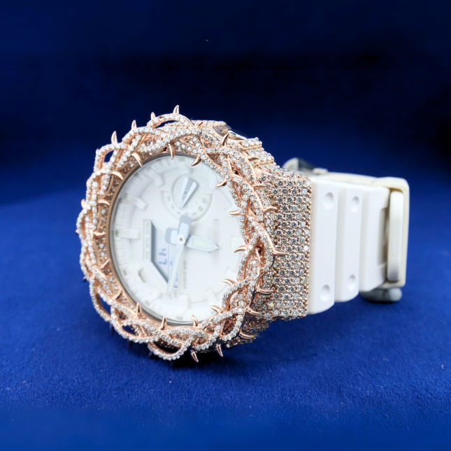 Elegante Reloj Digital Hip Hop Blanco con Bisel de Espinas en Oro Rosa Helado, Movimiento Miyota, Cristal de Zafiro, Correa de Goma, Estilo Moderno y Atrevido