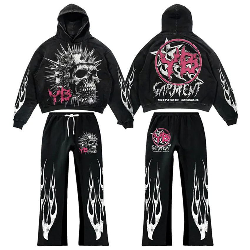 Chándal con estampado DTG personalizado para hombre con estilo, sudadera con capucha, pantalones acampanados, conjunto informal de 2 piezas, ropa de calle