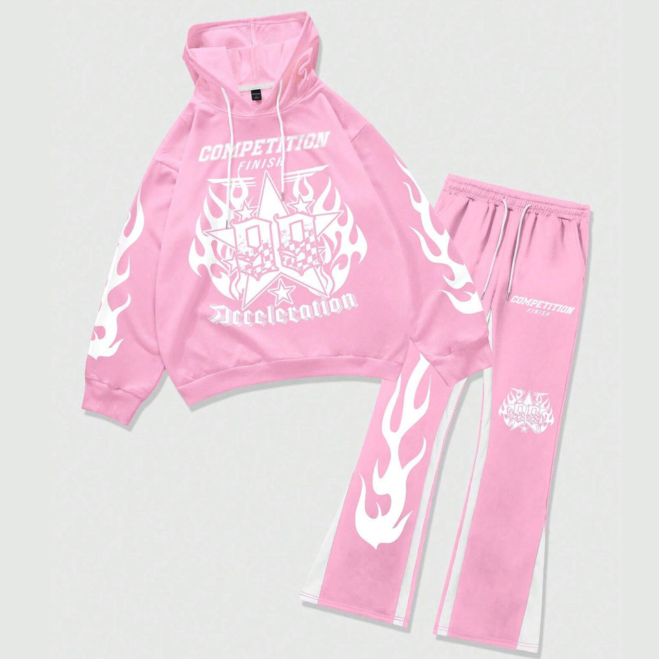 Chándal con estampado DTG personalizado para hombre con estilo, sudadera con capucha, pantalones acampanados, conjunto informal de 2 piezas, ropa de calle