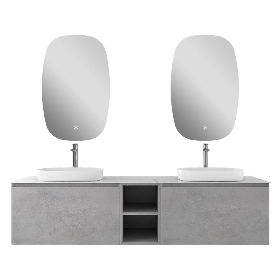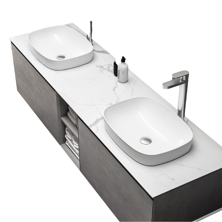 Mueble de Baño Moderno y Elegante con Espejo LED Flotante de Doble Lavabo, Encimera de Porcelana, Múltiples Cajones, Lavabo de Cerámica Montado en la Pared para Baño de Hotel