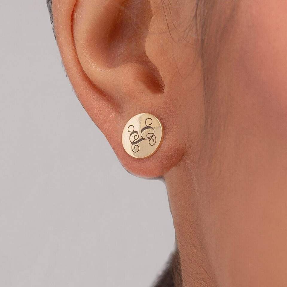Pendientes de Botón con Diseño de Disco, Modernos y Elegantes, con Monograma Inicial Grabado, Oro Sólido, Piedra Principal de Diamante, Precio Razonable, Certificado IGI