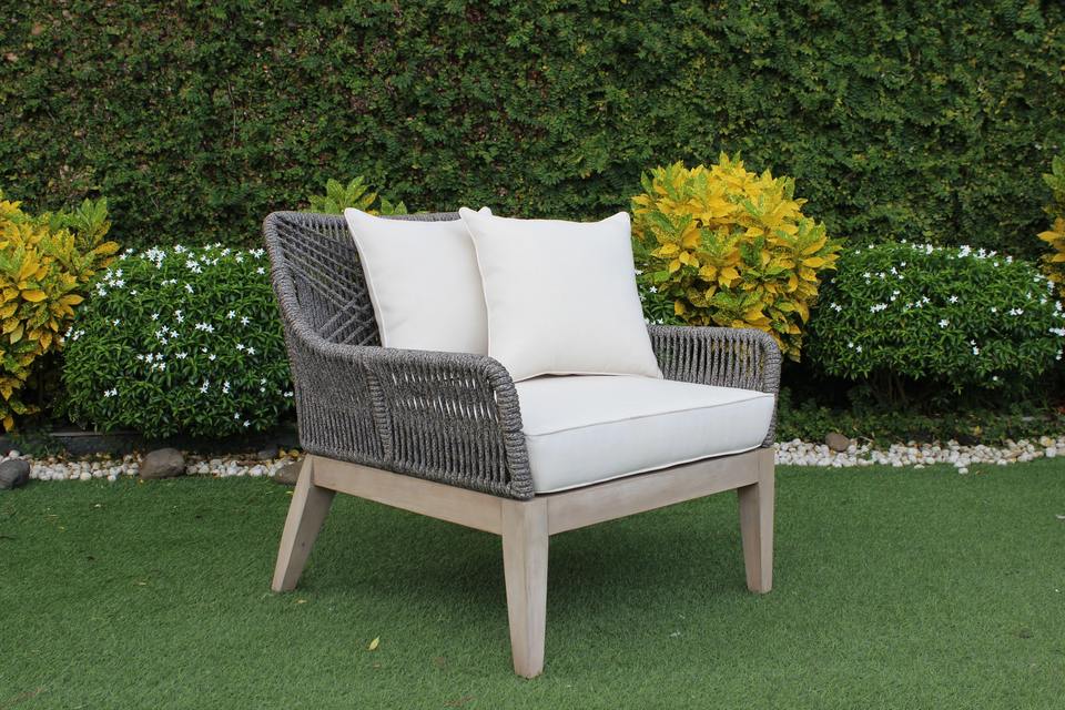 Elegante juego de sofás tejidos de cuerda redonda para exteriores con patas de madera para jardín y patio