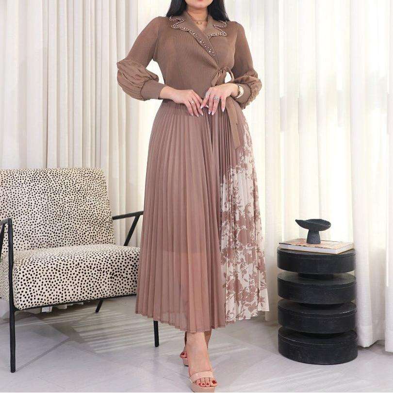 Elegante Vestido Maxi Plisado de Alta Costura con Estampado Patchwork de Estilo Oriental