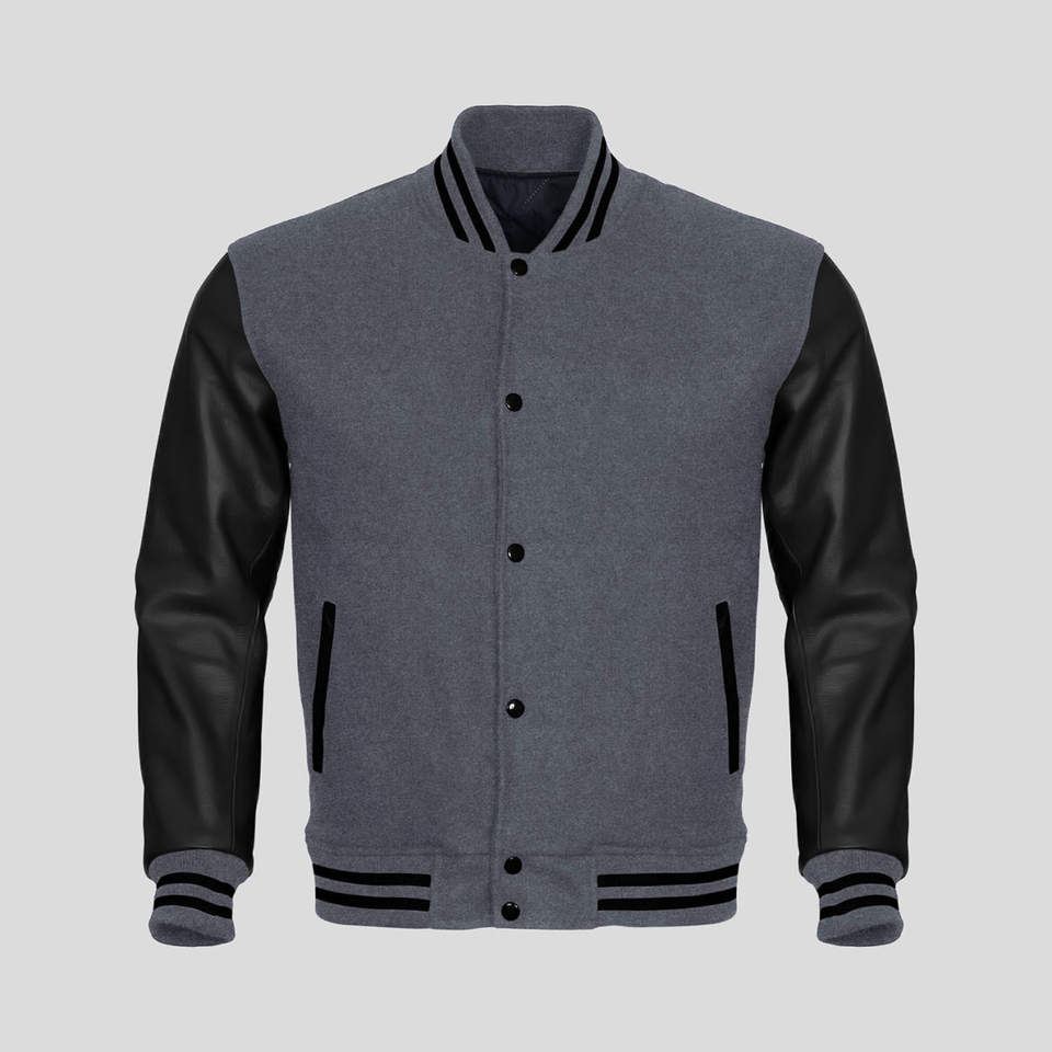 Chaqueta universitaria gris-blanca única con estilo, tela de invierno, cuerpo de lana, brazos de cuero, chaqueta CollegeBaseballjacket para hombres