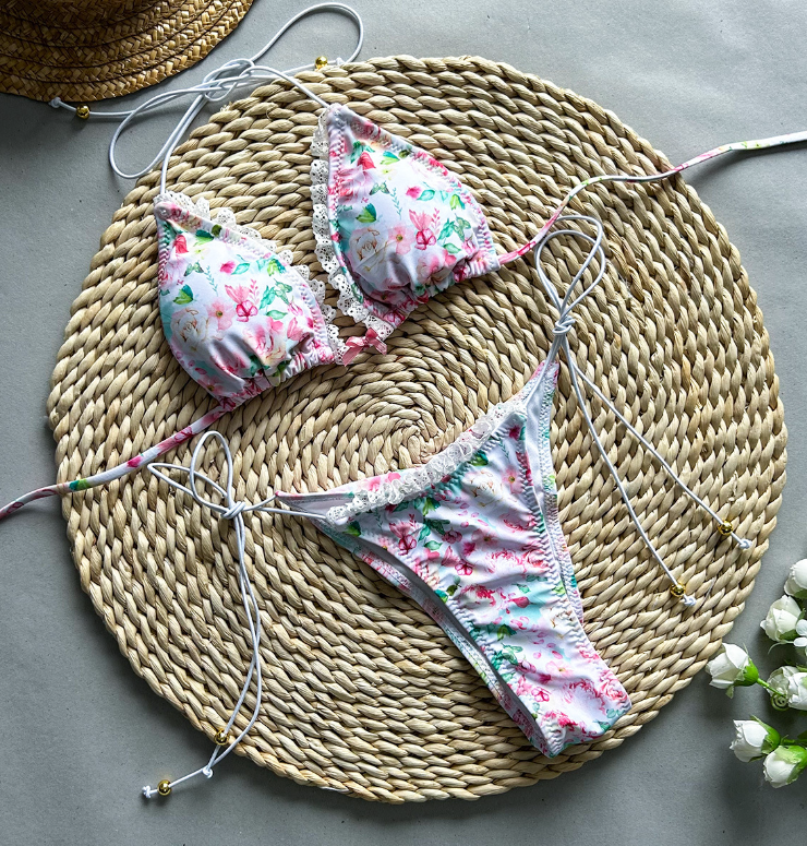 Top triangular elegante y cómodo con estampado de flores de encaje, traje de baño Sexy para mujer, Micro Bikini brasileño