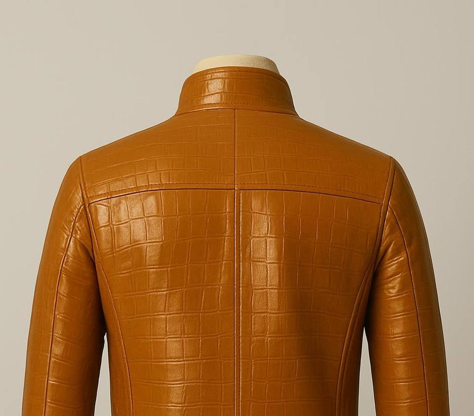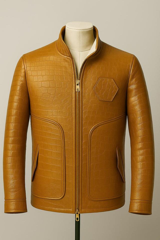 Chaqueta de cuero genuino de vaca con relieve de cocodrilo, que ofrece una textura de élite, un acabado refinado y un impacto de moda premium.