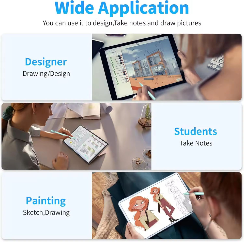 Amplia compatibilidad: Funciona con todos los dispositivos de pantalla táctil capacitiva, incluidos smartphones, iPads y tabletas educativas., Carga rápida de 30 minutos: repone la energía rápidamente para un tiempo de inactividad mínimo., 8-10 horas de uso continuo: La batería de larga duración permite una productividad o aprendizaje durante todo el día., Ahorro de energía inteligente: Se apaga automáticamente después de 30 minutos de inactividad para preservar la batería., 3 - Meses de tiempo en espera: Mantiene la carga durante períodos prolongados cuando no está en uso., Amplia Selección de Colores: Múltiples colores estándar disponibles, con opciones personalizadas bajo pedido., Experiencia de escritura natural: baja latencia de 0,1 segundos y efecto de desplazamiento de 2 a 5 mm que imitan la sensación real de escribir con un bolígrafo sobre papel., Práctica adsorción magnética lateral: permite un almacenamiento fácil y seguro en dispositivos compatibles., Diseño duradero y reemplazable: cuerpo de aleación de aluminio y punta de bolígrafo POM reemplazable para mayor longevidad., Operación fácil de usar: Cuenta con un interruptor táctil superior y un puerto de carga lateral Tipo-C para un uso rápido y sin complicaciones.