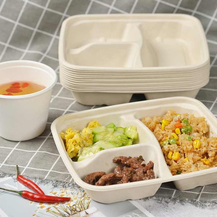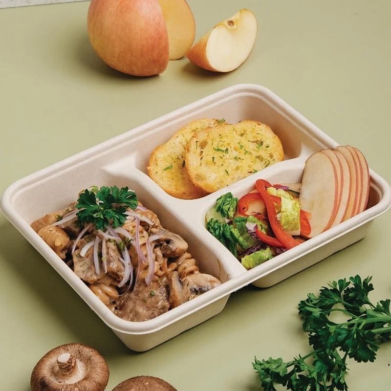 Bandeja Cuadrada Biodegradable de 3 Compartimentos de Bagazo de Caña de Azúcar con Tapa Transparente, Apta para Microondas, Contenedor de Alimentos Ecológico 2026