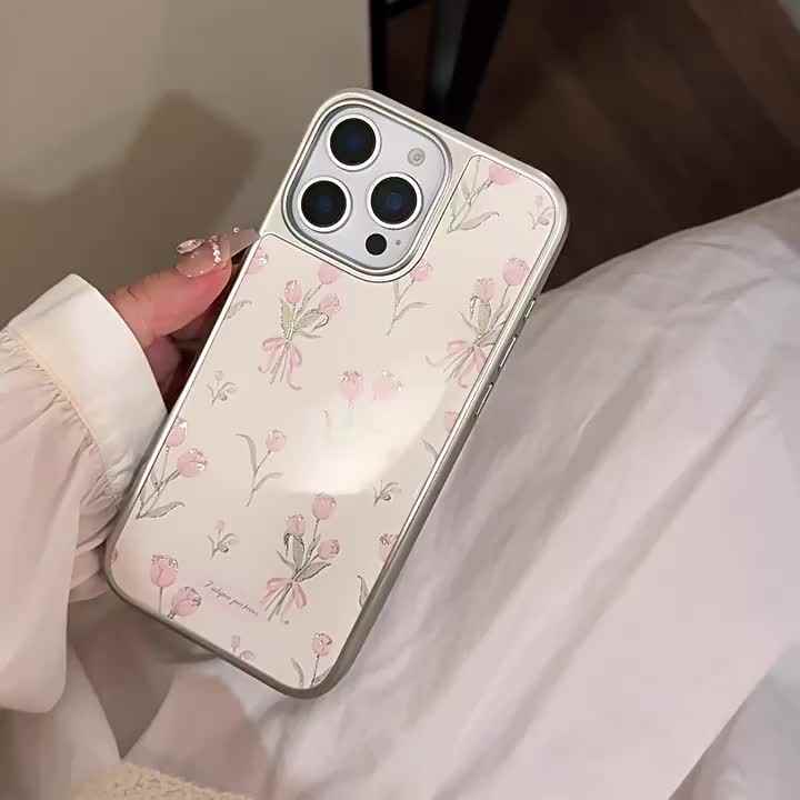 Adecuado para iPhone 16 Pro Max, funda de teléfono de resina de oro rosa, funda dura de teléfono resistente a caídas galvanizada de tulipán rosa