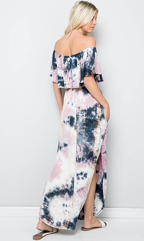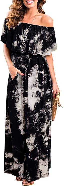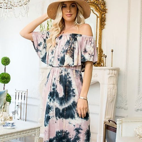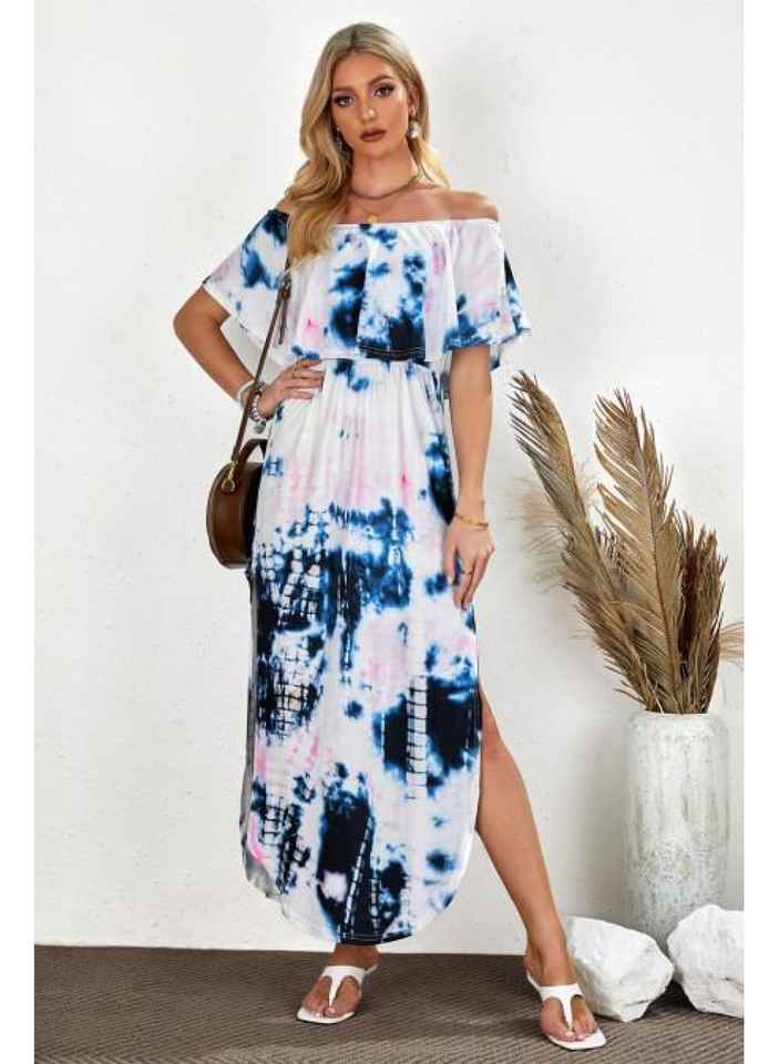 Verano tamaño libre señora Boho azul fuera del hombro Maxi vestido Sexy sin mangas volantes mujeres elegante suelto largo Vestido de playa