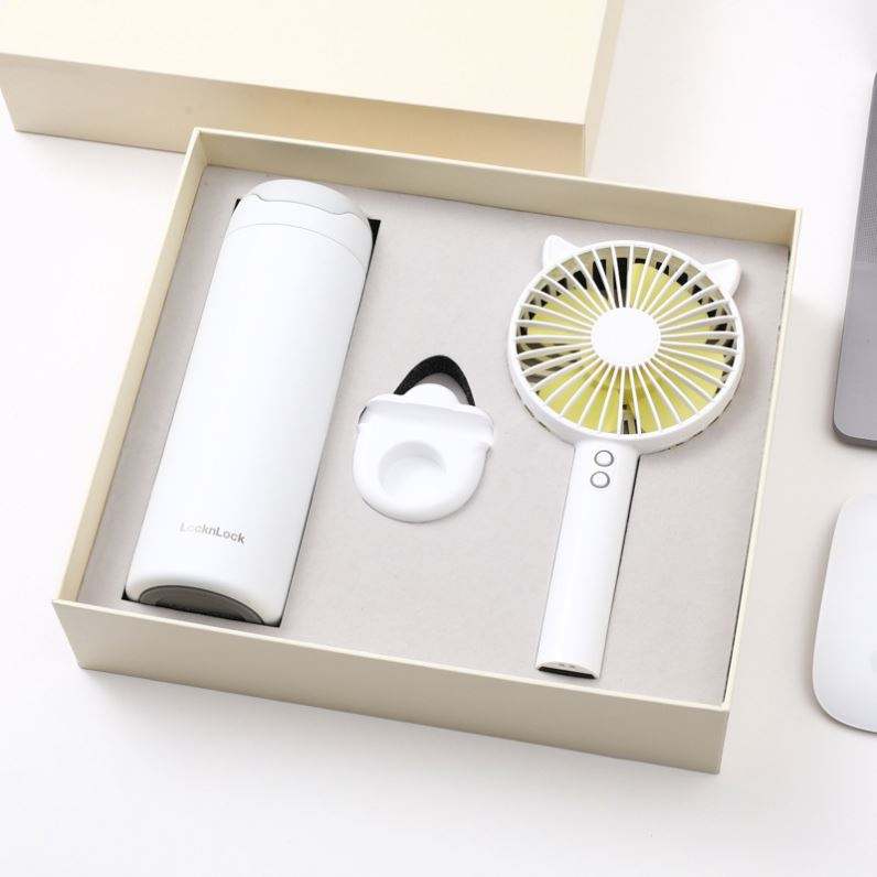 Set de Regalo Creativo de Verano: Ventilador Pequeño y Taza con Cierre, de Acero Inoxidable, con Serigrafía, Diseño Moderno y Sencillo, de Alta Calidad