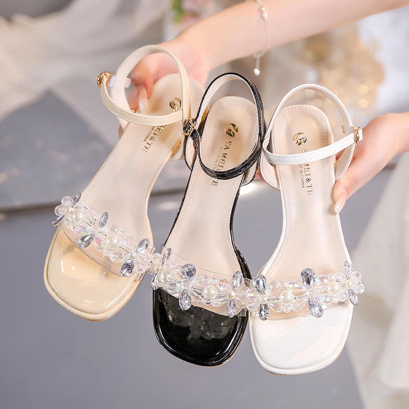 Novedad de Verano: Sandalias de Tacón Grueso con Pedrería y Punta Cuadrada, Tacón Medio, con Tira Romana y Perlas para Mujer