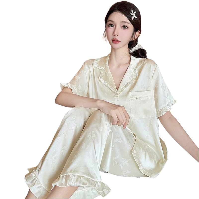 Verano primavera transpirable suave satén elástico cintura Casual pijamas de mujer de manga corta pantalones largos ropa de casa secado rápido al por mayor