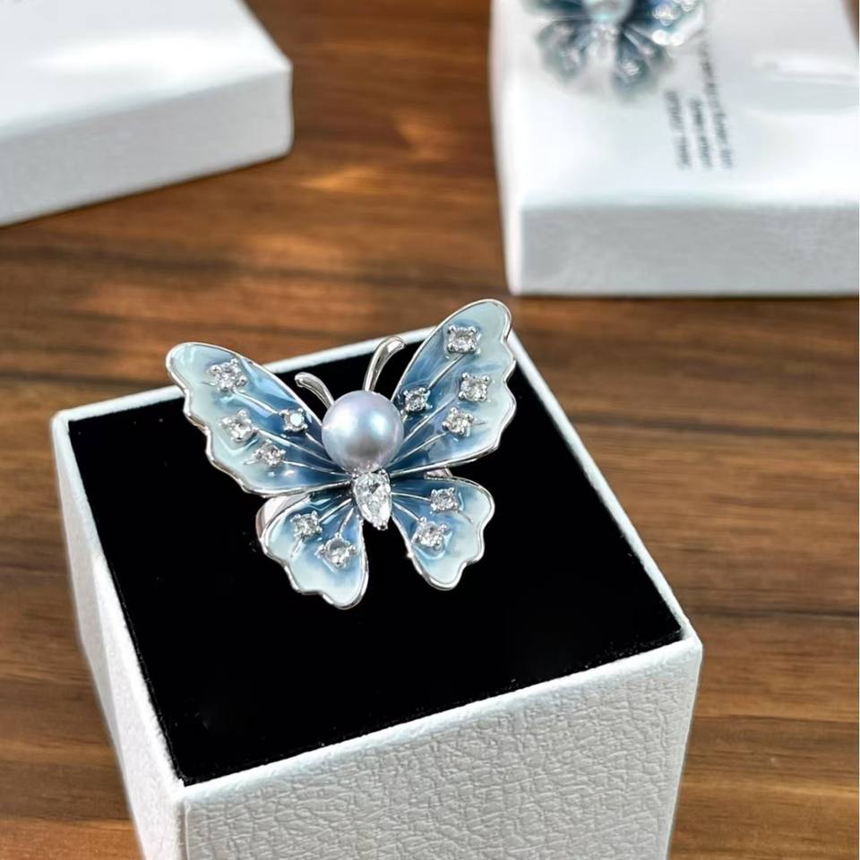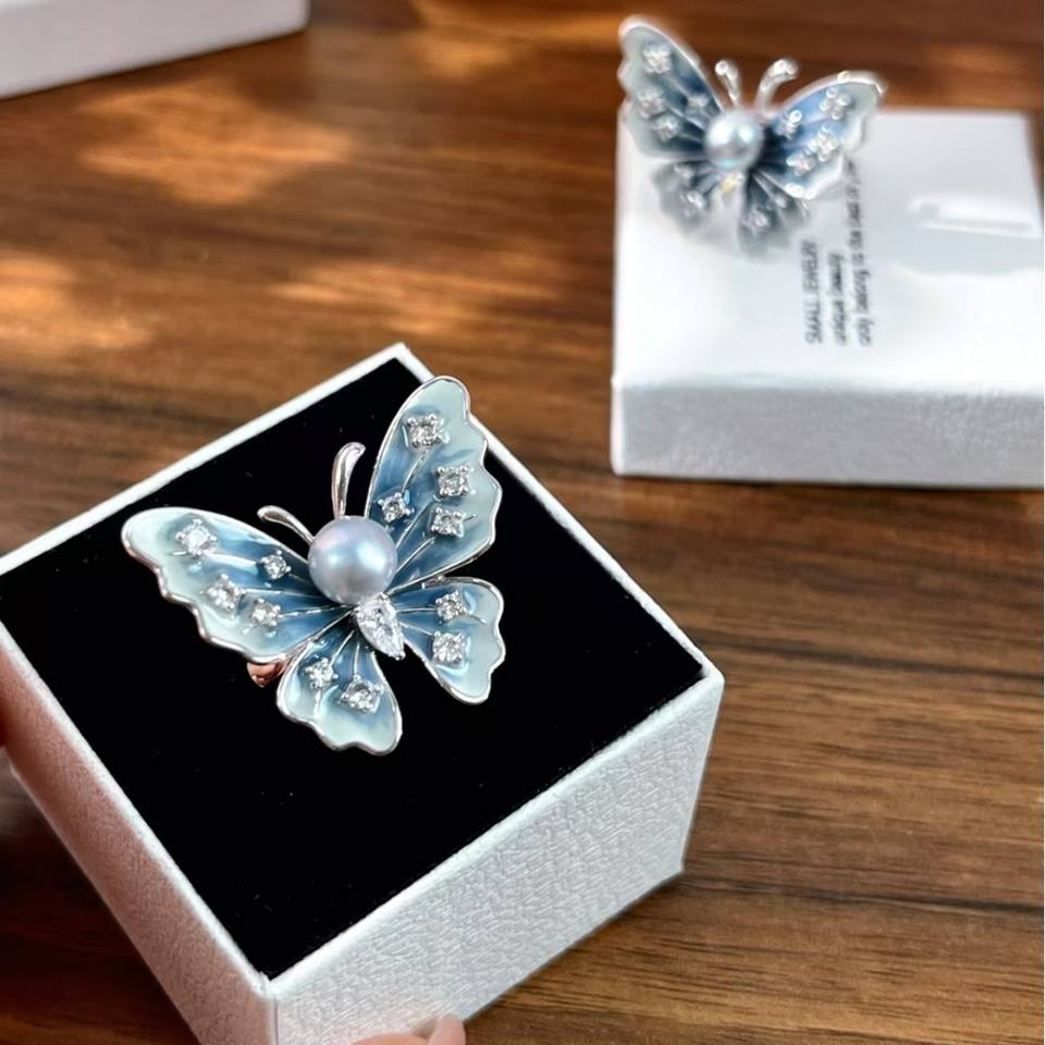 Broches de Moda de Alta Gama Estilo Vacaciones de Verano, Aretes de Zirconia con Diseño de Gota de Mar Azul Salado y Mariposa, con un Diseño Fresco y Original