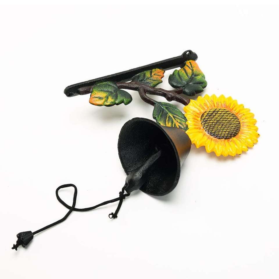 Campana de Pared de Hierro Fundido con Forma de Girasol, Campana de Puerta Pintada de Negro, Amarillo y Verde, Campana de Jardín de Metal Pesado de Doble Cara en Venta