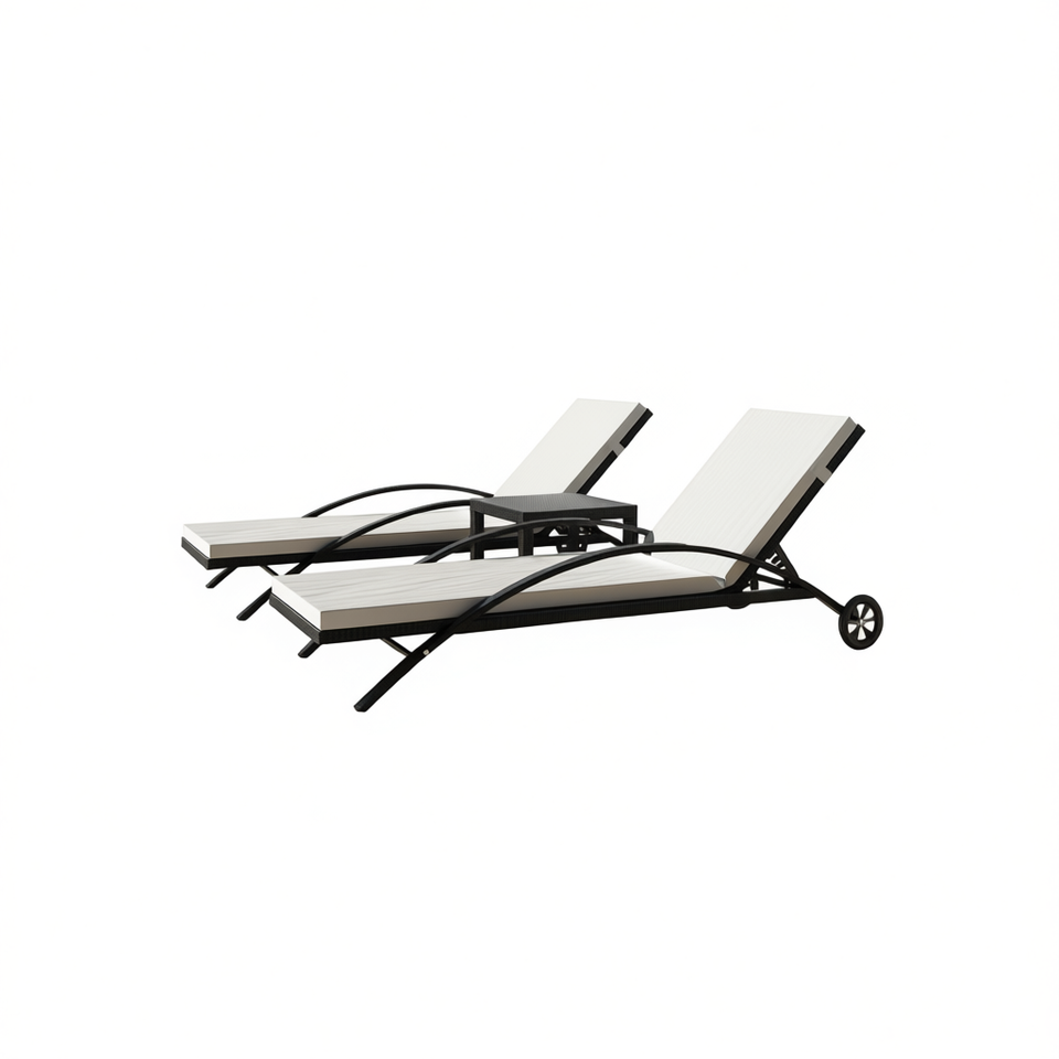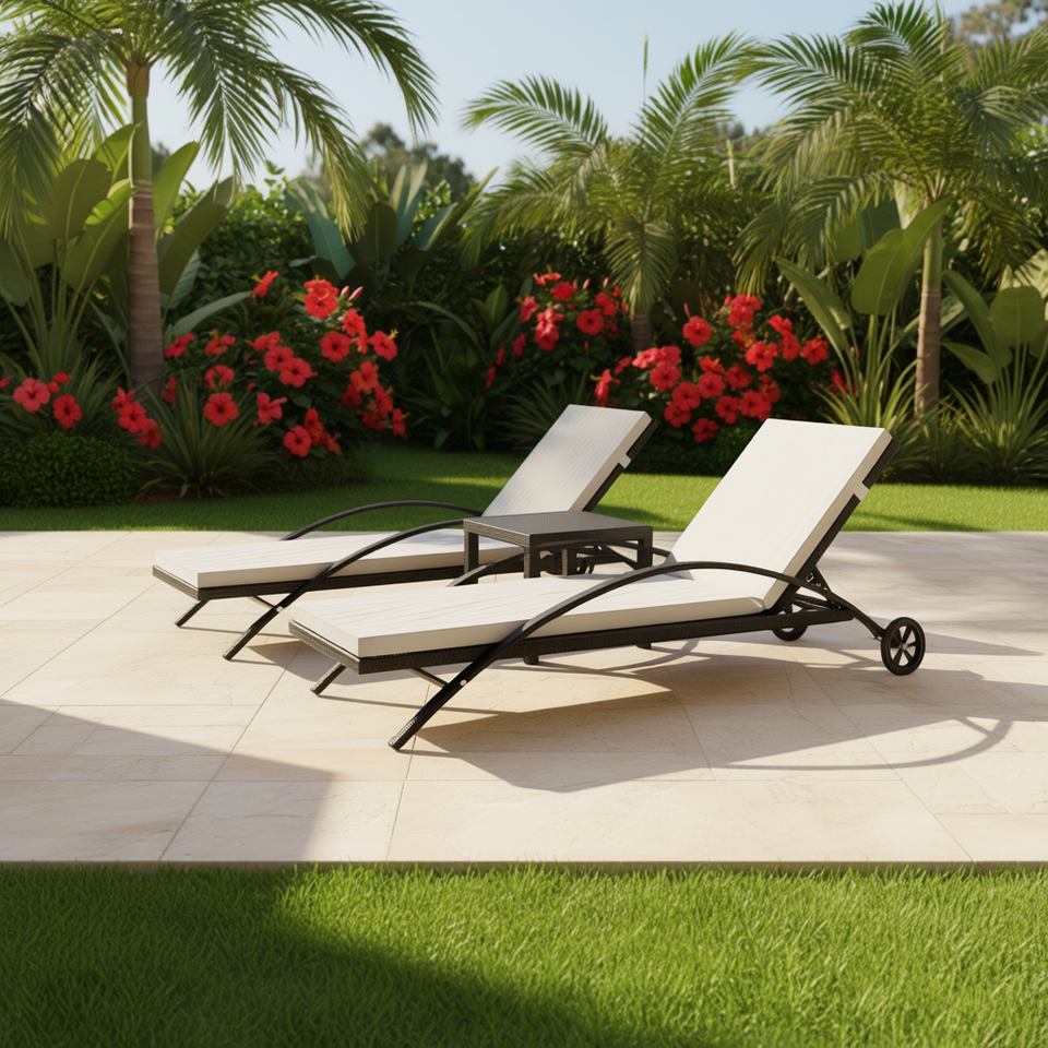 Tumbonas con Mesa de Ratán Sintético, Muebles de Exterior para Patio, Reclinables, Acolchadas, Diseño Moderno