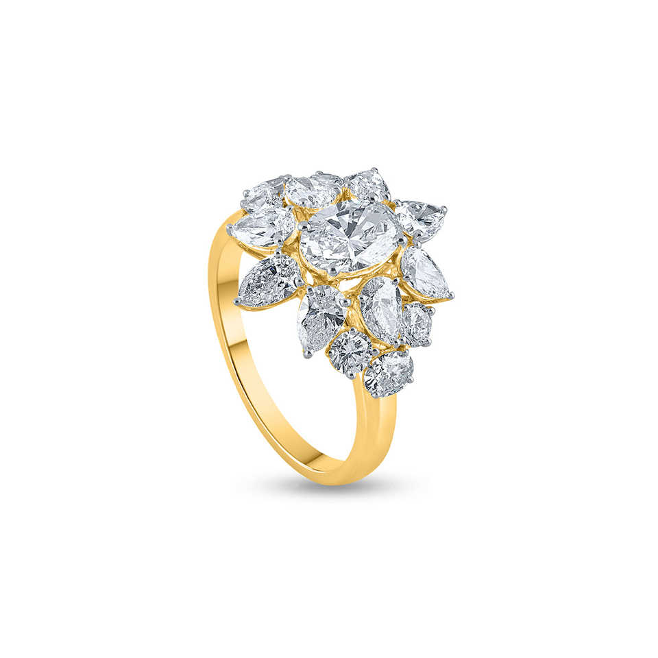 Imagen:Un anillo de diamantes de racimo floral de lujo elaborado en oro amarillo.