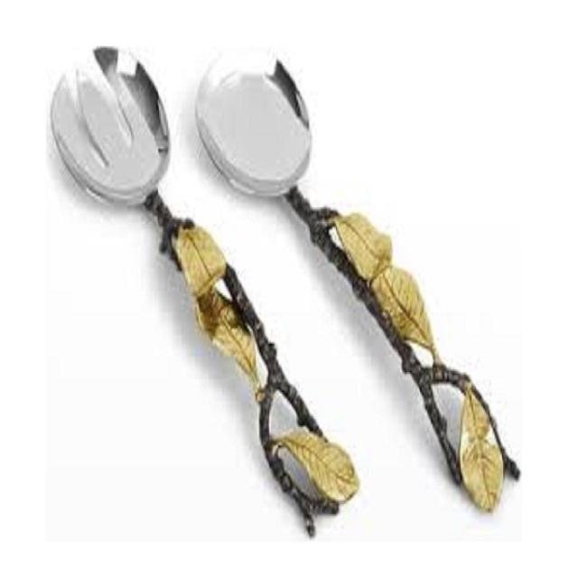 Diseño de girasol, mango chapado en oro, metal, acero inoxidable, juego de servidor de ensalada con diseño de Rama, cuchara, tenedor, herramienta para servir, cubiertos