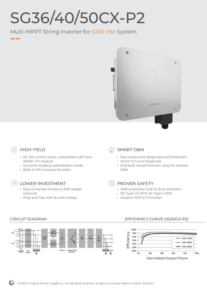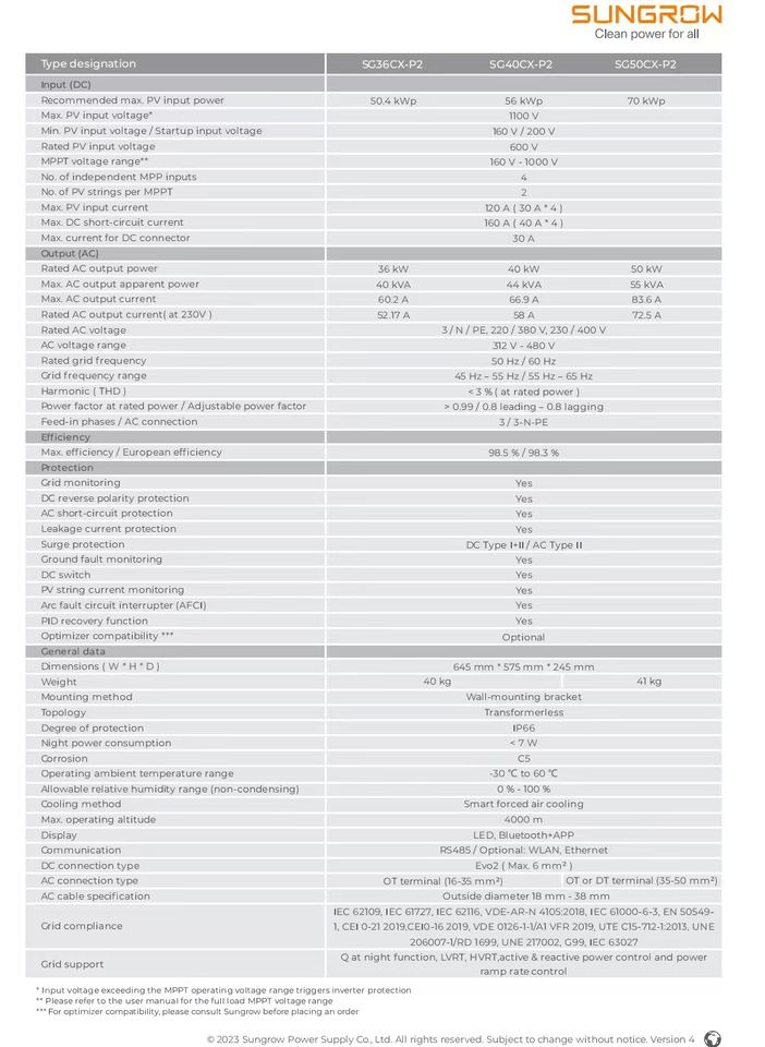 Inversor solar multi-mppt Sungrow de alta eficiencia de 1000V CC para sistema fotovoltaico