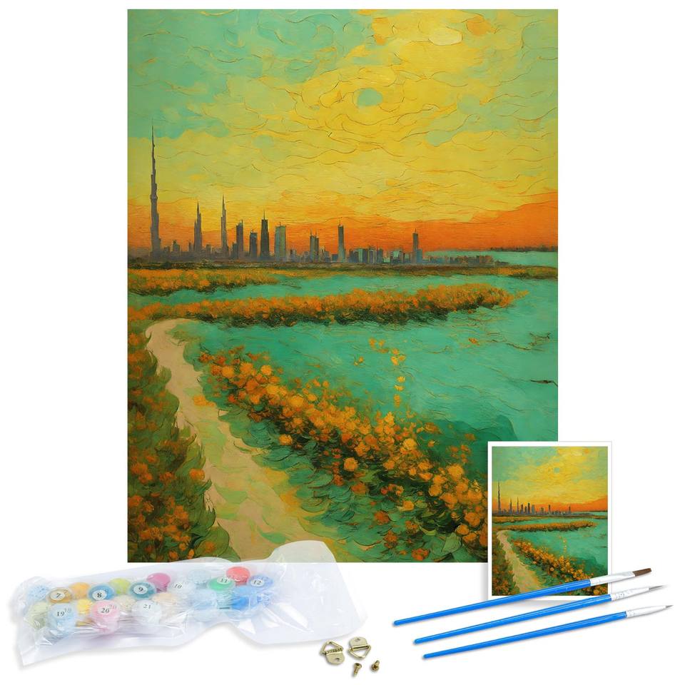 Sunset Natural Building Paisaje Pintura Al Óleo Por Números Para Adultos. Pintura al óleo pintada a mano por números